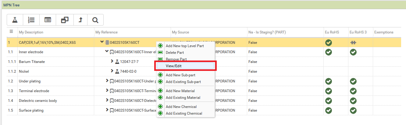 Each time values are updated that may affect the compliance verdict the line(s) in question are highlighted in red indicating that the verdict needs to be refreshed. This will happen automatically every 24 hours but can be triggered manually per part as follows;